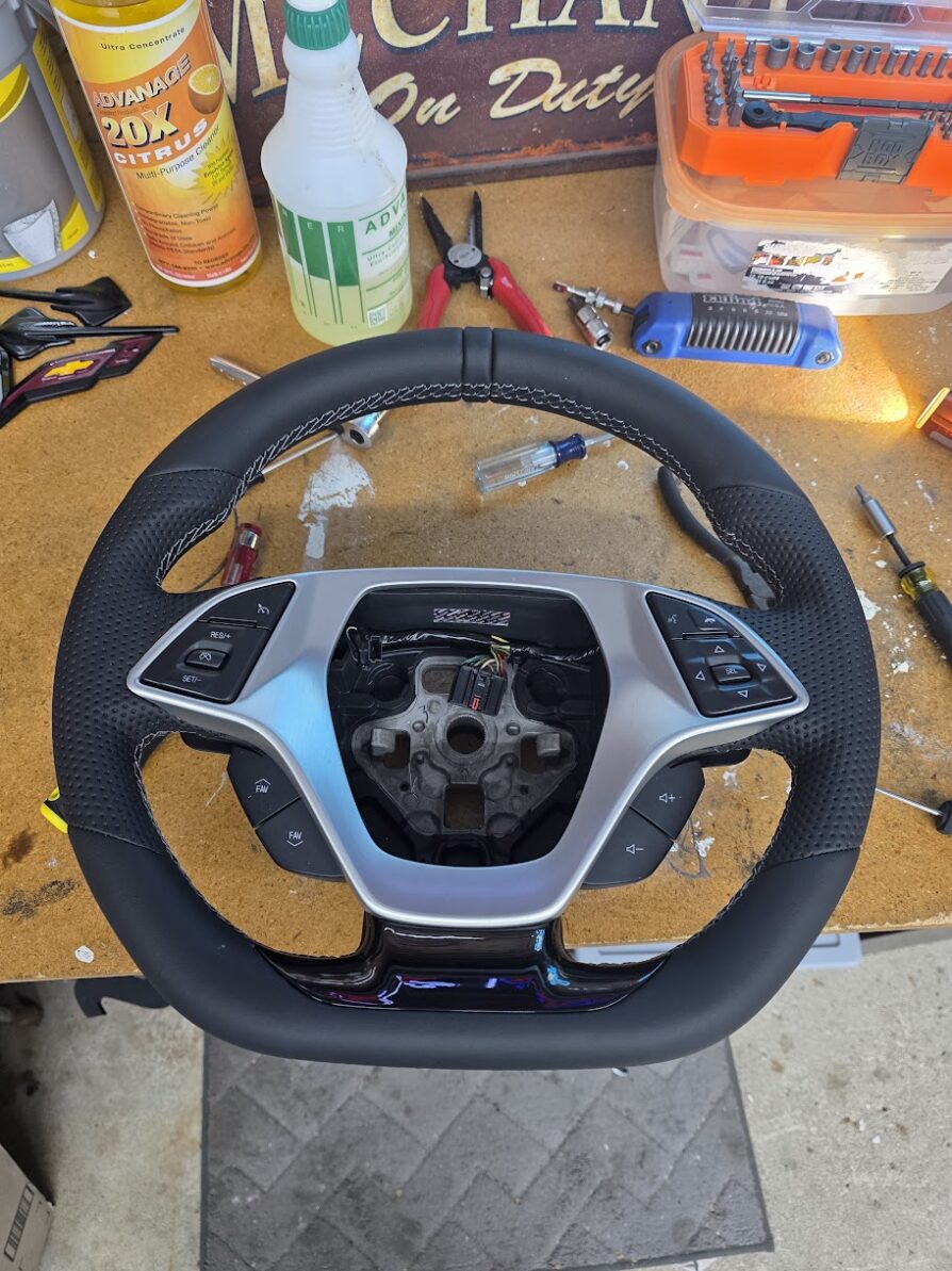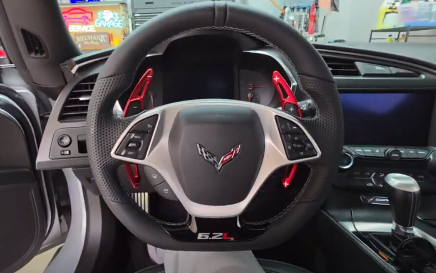 I spent around 45 minutes replacing this part, as I also needed to transfer the wire loom, control buttons, and shifter paddles. Managing the various types of electrical connectors was challenging, as I always seem to break something during this process. However, everything worked perfectly once I finished, and there were no setbacks. Overall, it was a fairly straightforward task, considering the circumstances. A few weeks later, I added the aluminum paddle shifter extensions and the 6.2L decal that is designed to go on the fender vents. The decal looks off-center, but it isn’t. The red L throws the eye off a little bit.